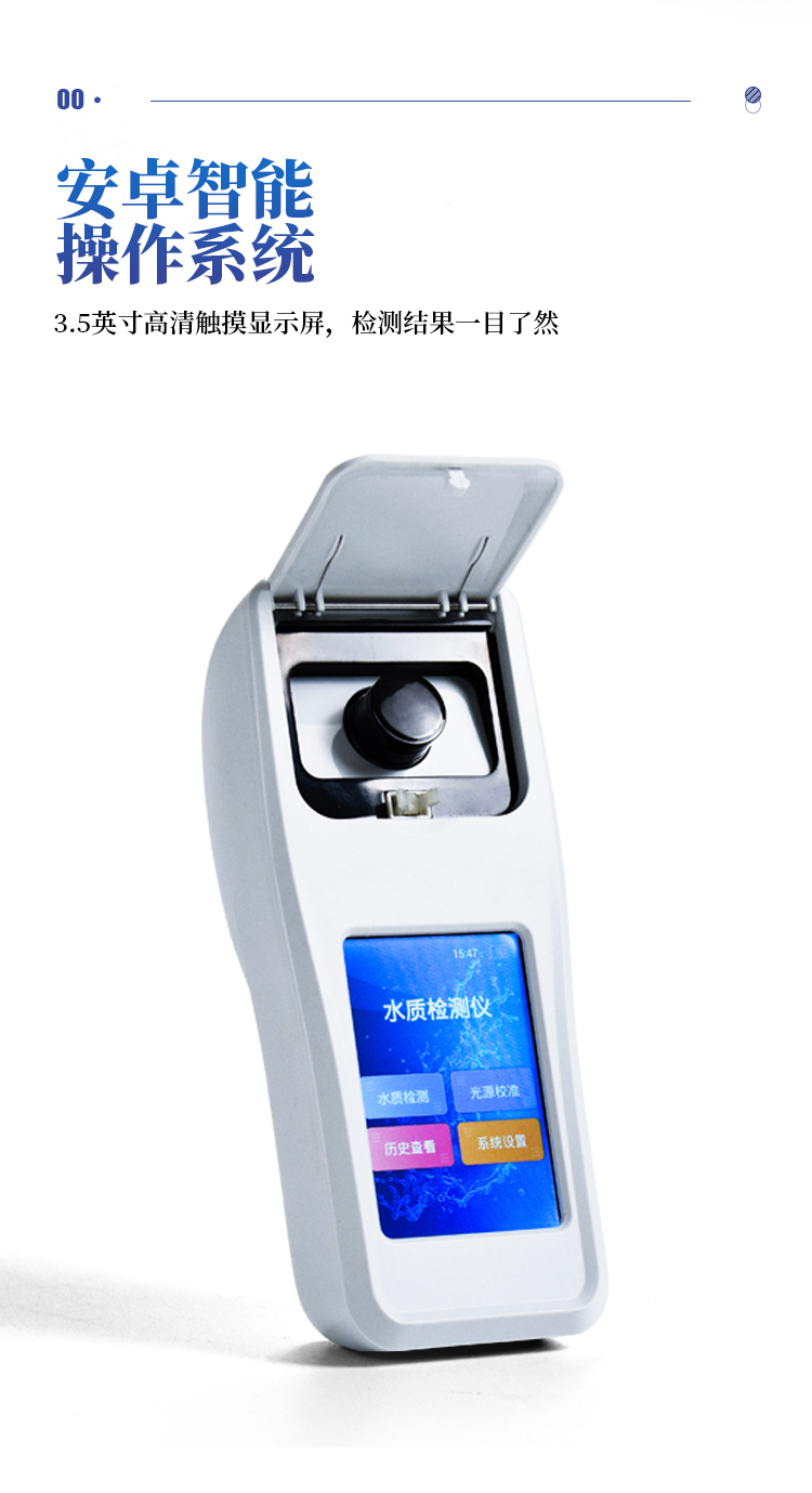 利用白光LED对显色液进行照射,传感器可得出其三光色值,首先检测空白液的三光色值,再检测被测样品的三光色值,根据波长与颜色的关系,按照试剂反应后的颜色,将三光色值归一化,根据吸光度公式A=lg(I0/I1),其中I0为入射光强,I1为透射光强,得到A值后,仪器根据内置标准曲线其对应的吸光度(A)可准确计算出检测项目在水体中的浓度值。