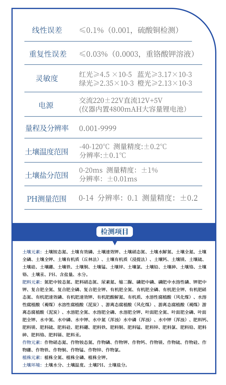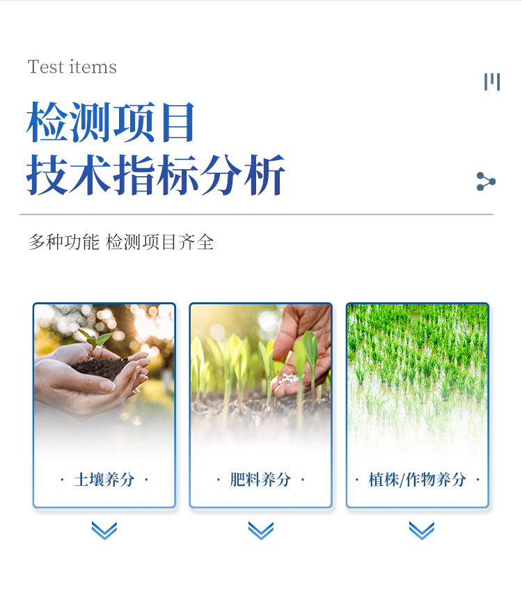 土壤:土壤铵态氮、土壤有效磷、土壤速效钾、土壤硝态氮、土壤水解氮、土壤全氮、土壤全磷、土壤全钾、土壤有机质(丘林法)、土壤有机质(浸提法)、土壤钙、土壤镁、土壤硫、土壤硅、土壤硼、土壤铁、土壤铜、土壤锰、土壤锌、土壤氯、土壤钼、土壤铅、土壤砷、土壤铬、土壤镉、土壤汞、土壤镍、土壤铝、土壤氟、土壤钛、土壤硒、PH、含盐量、水分。