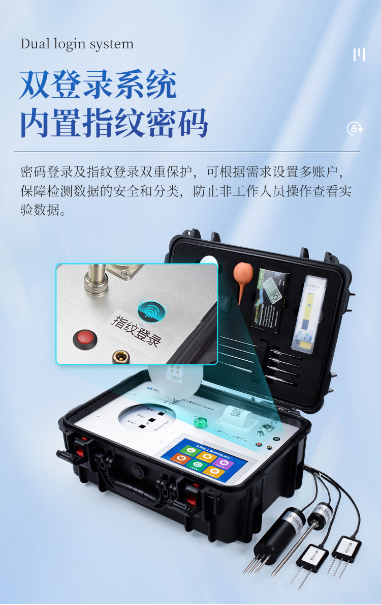 4.密码登录及指纹登录双重保护,可根据需求设置多账户,保障检测数据的安全和分类。