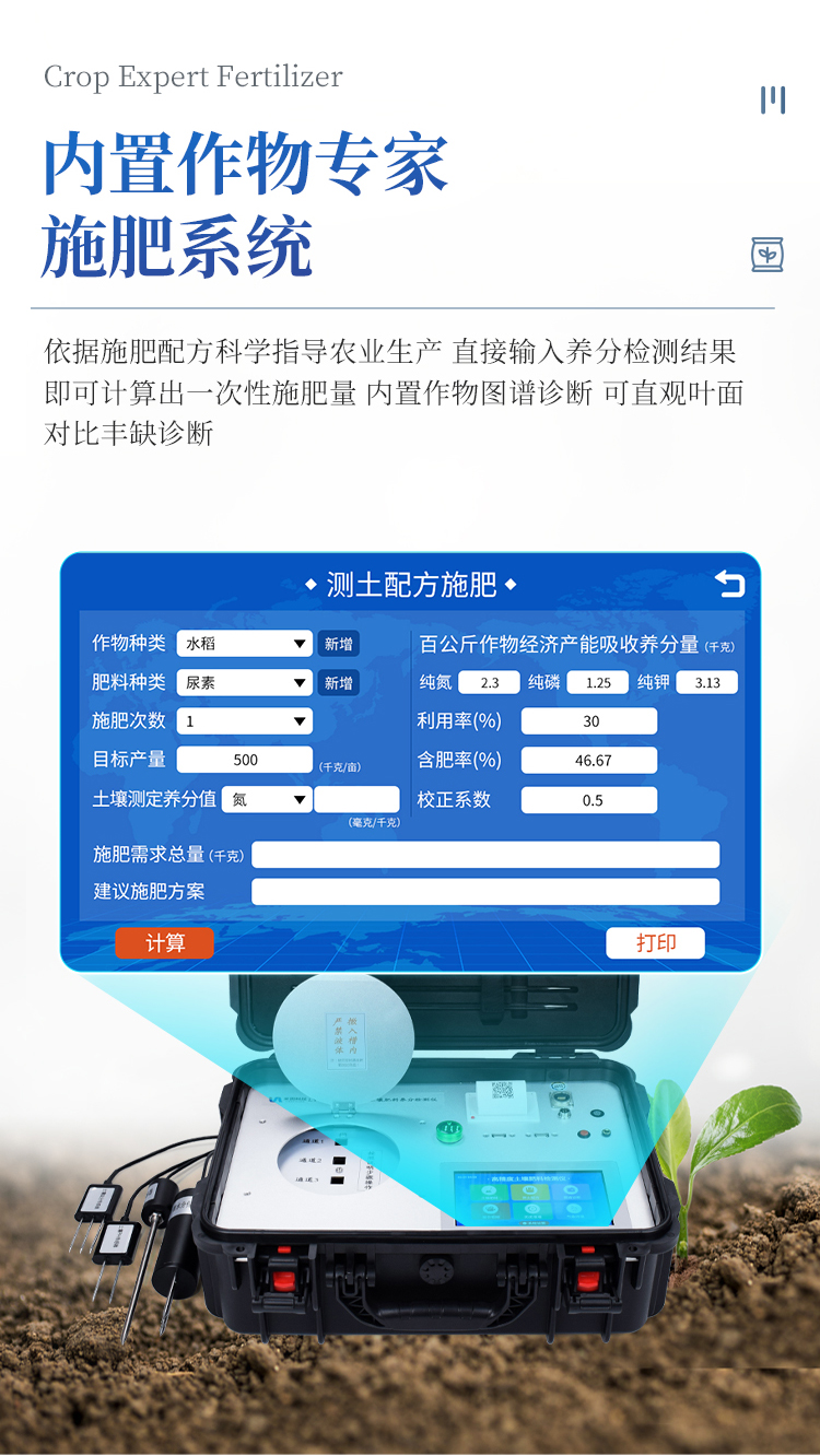16.内置测土配方施肥系统,检测完成后可直接进行测土配方施肥计算;同时具有单独配方施肥计算模块;仪器内置百余种常见经济作物标准养分值,内置施肥校正系数,可对目标产量计算施肥量,以此指导农业生产;测土配方施肥结果可打印,打印内容包含作物种类、肥料种类、目标产量、需求总量、建议施肥方案。